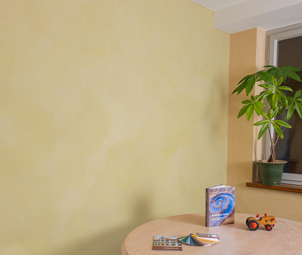 Limewash lässt sich mit Erd- und Mineralpigmenten individuell in über 250 Farbtönen abtönen. Dazu die Pigmente einfach in Wasser anrühren und der Farbe beimischen. Als Orientierung für die richtige Dosierung dient der Kreidezeit-Farbfächer.